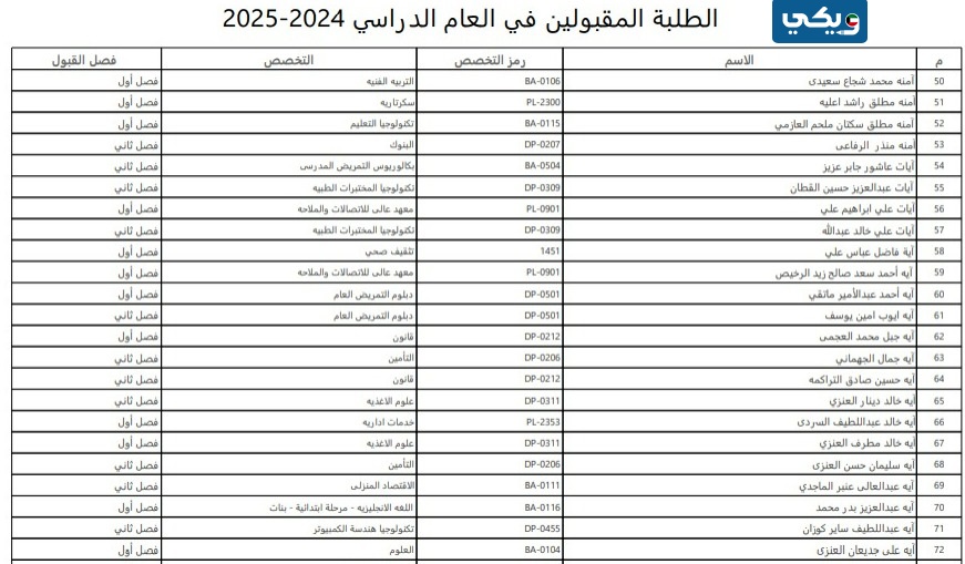 يوضح الجدول الآتي أسماء عدد من المقبولين في التطبيفي عام 2024م، ويمكن الاطلاع على قائمة الأسماء كاملة “من هنا” مباشرة.[1]