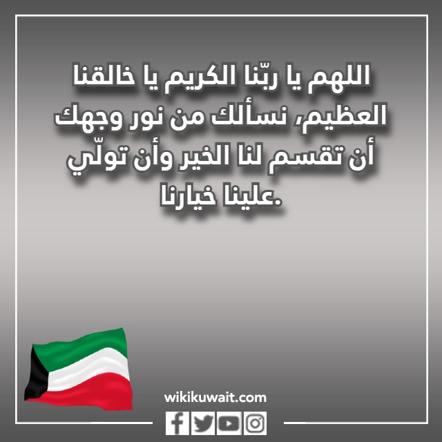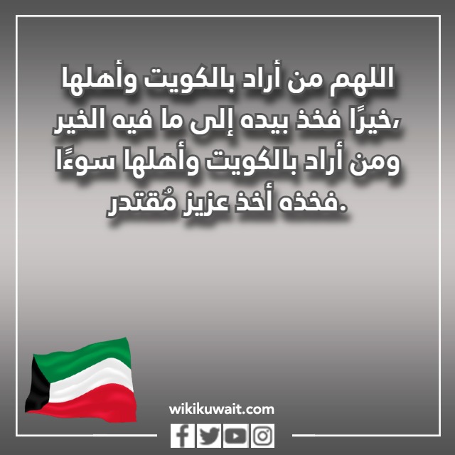 | الدعاء الثالث | اللهم من أراد بالكويت، وأهلها خيرًا فخذ بيده إلى ما فيه الخير، ومن أراد بالكويت وأهلها سوءًا، فخذه أخذ عزيز مُقتدر، اللهم أكرم ولي أمرنا بالبصر والبصيرة ويسّر عليه القرارات، واكتب على يديه النجاح والرفاهية للجميع. |