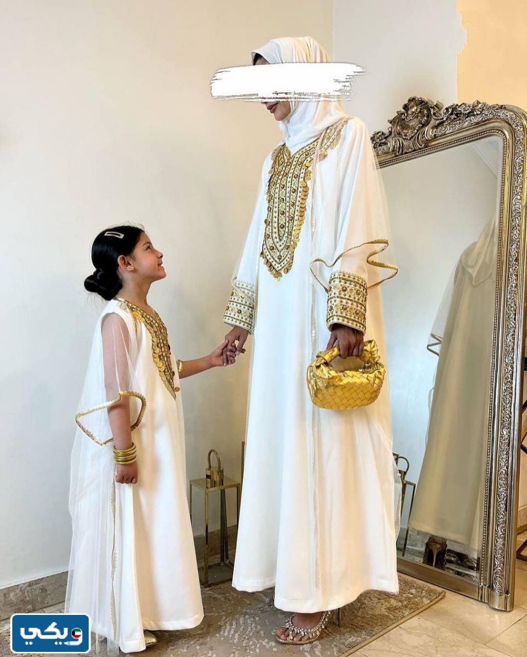 - دراعة بيضاء أنيقة تتوفر بمقاسات للأم وابنتها: 55 دينار كويتي للأم، و30 دينار كويتي للابنة.