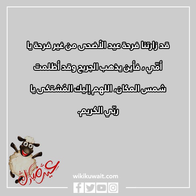 | العبارة الرابعة | قد زارتنا فرحة عيد الأضحى من غير فرحة يا أبي، قد زارتنا مشاعر عيد الأضحى من غير مشاعر يا أمّي، فأين يذهب الجريح، وقد أظلمت شمس المكان، اللهم إليك المُشتكى يا ربّي الكريم. |