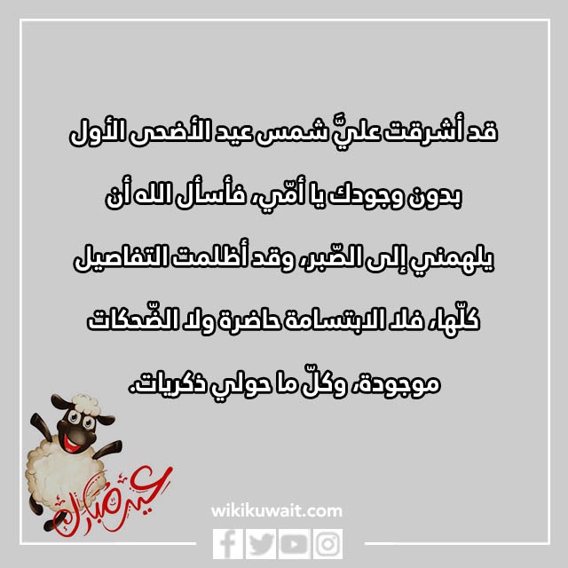- قد أشرقت عليَّ شمس عيد الأضحى الأول بدون وجودك يا أمّي، فأسأل الله أن يلهمني إلى الصّبر، وقد أظلمت التفاصيل كلّها، فلا الابتسامة حاضرة ولا الضّحكات موجودة، وكلّ ما حولي ذكريات.