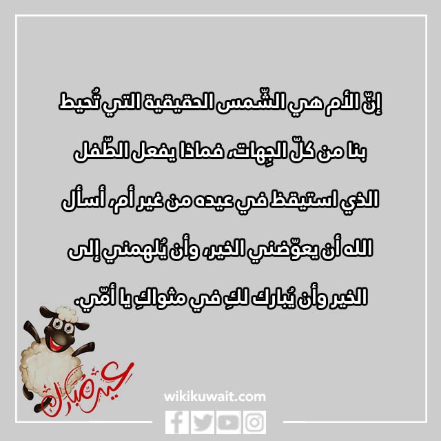 - إنّ الأم هي الشّمس الحقيقية التي تُحيط بنا من كلّ الجِهات، فماذا يفعل الطّفل الذي استيقظ في عيده من غير أم، أسأل الله أن يعوّضني الخير، وأن يُلهمني إلى الخير، وأن يُبارك لكِ في مثواكِ يا أمّي.
