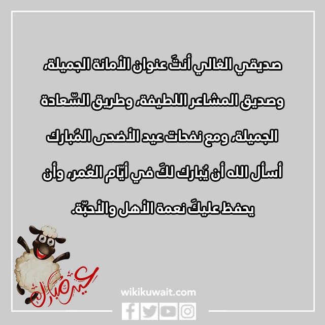 - صديقي الغالي أنتَ عنوان الأمانة الجميلة، وصديق المشاعر الجميلة، وطريق السعادة الجميلة، ومع نفحات عيد الأضحى المُبارك أسأل الله أن يُبارك لكَ في أيّام العُمر، وأن يحفظ عليكَ نعمة الأهل والأحبّة.