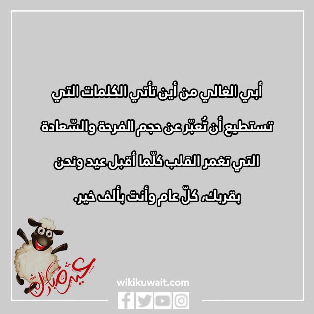 - بمناسبة عيد الأضحى المُبارك يسرّني أن أُبارك لكم وأن أجدد العهد على المحبّة والإخلاص، فأنتم صُحبة الخير، وطريق الفرحة والسعادة، وعنوان الأخلاق الحميدة، كلّ عام وأنتم إلى الله أقرب، وإلى طاعته أرغب.
