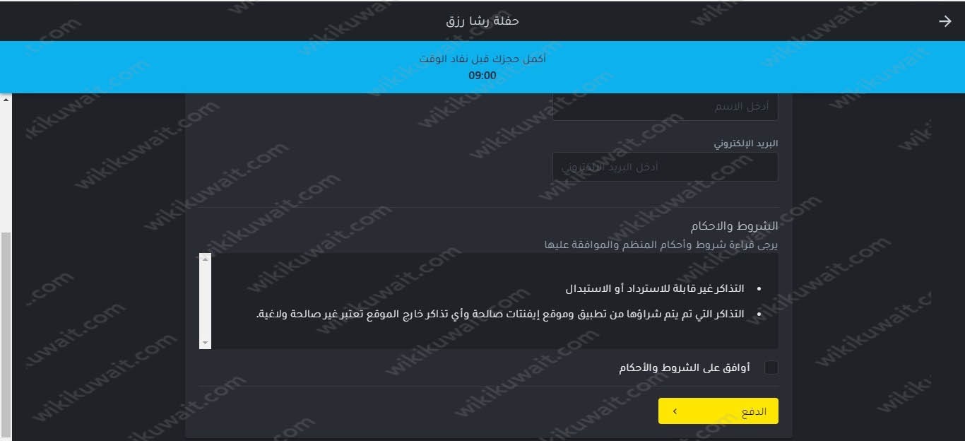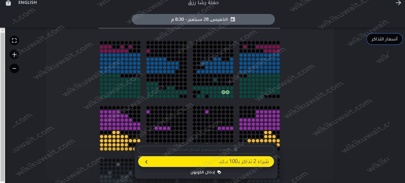 رابط حجز تذاكر حفلة رشا رزق في الكويت 2023 eventat.com متمثلًا في موقع إيفنتات الإلكتروني الذي يتيح للمتقدم بالحجز بالحصول على تذكرة إلكترونيةٍ تخولُّه من الدخول إلى الحفلة، ذلك بعد إتمام خطوات الحجز الإلكتروني باتباع الخطوات المرفقة أعلاه، واستكمال عملية الدفع وفقًا لفئة التذكرة المختارة، علمًا أنَّ تذاكر حفلة رشا رزق في الكويت 2023 التي يتم شراؤها من خارج الموقع تعتبر غير صالحةٍ ولاغيةٍ.