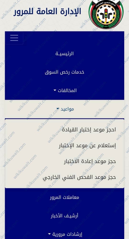 - اختيار “مواعيد” من القائمة الرئيسية لصفحة الإدارة العامة للمرور في الكويت.