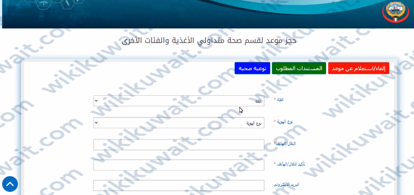 يتم حجز موعد زيارة قسم متداولي الأغذية في الكُويت عبر موقع وزارة الصحة كما يأتي:
