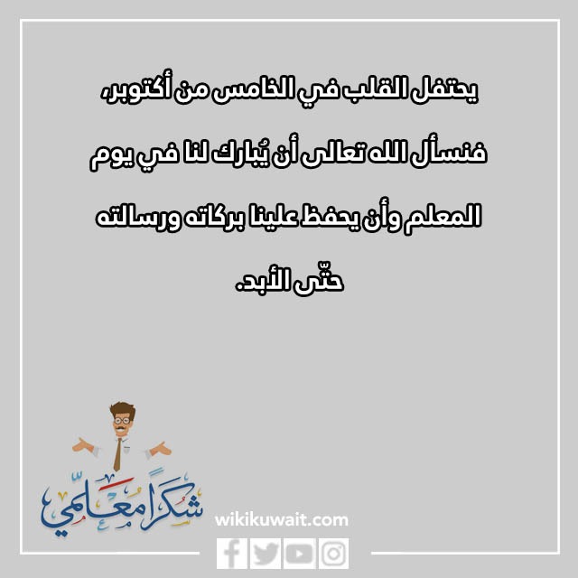 - أجمل ما قيل عن يوم المعلم في الكويت - في يوم المعلّم الكويتي تتراقص كلمات الحُب والوفاء لتلك الشّخصية التي تستحقّ التّقدير والحفاوة، فالمعلّم هو سفير التضحية والفِداء في كلّ المراحل والعُصور، ويكفيه فخرًا أنّ الله قد بعث أنبياءه معلّمين للناس كافّة.