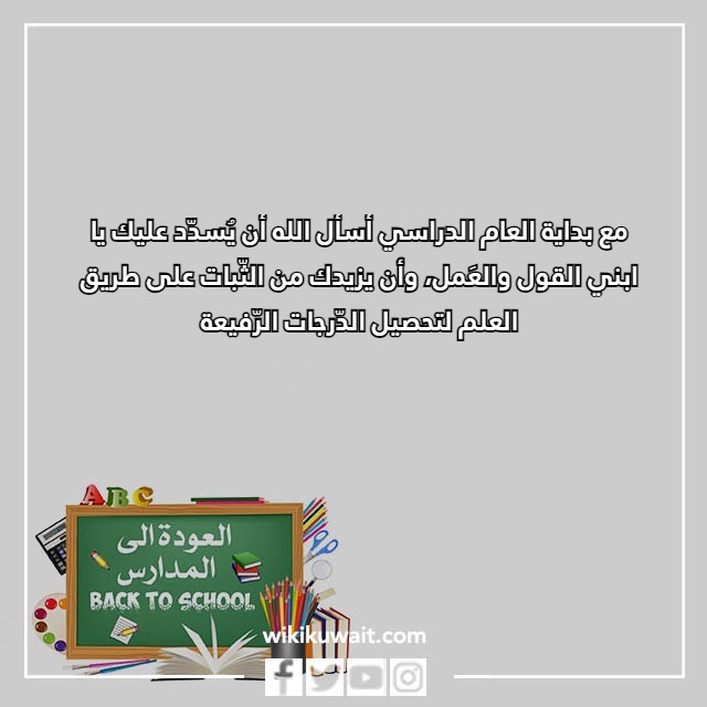 | العبارة الأولى | مع بداية العام الدراسي أُبارك لكَ من القلب يا ولد قلبي الغالي، وأحُيطك بالله تعالى أن يكون لك في كلّ موعد، وأن يحفظ عليك نعمة العقل، وأن يرزقك السّلامة في القول والعَمل، والتوفيق إلى ما فيه الخير. |