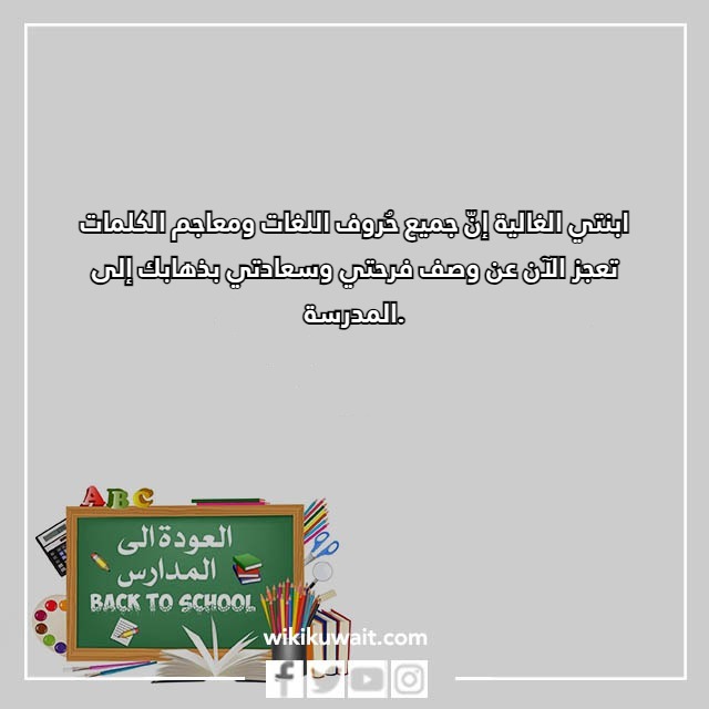 - ابنتي الغالية إنّ جميع حُروف اللغات ومعاجم الكلمات تعجز الآن عن وصف فرحتي وسعادتي بذهابك إلى المدرسة، لتبدأ أولى خُطواتك على طريق العلم والتّعليم، أسأل الله أن يوفّقك لما فيه الخير، وأن يزيدك من خيراته.