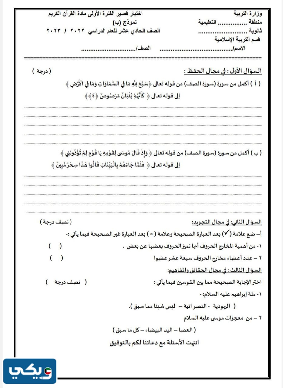 نماذج اختبار قران حادي عشر 2024 الكويت