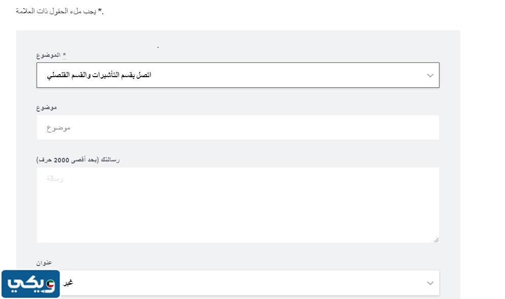 - اختيار موضوع الرسالة من القائمة المنسدلة “اتصل بقسم التأشيرات والقسم القنصلي”