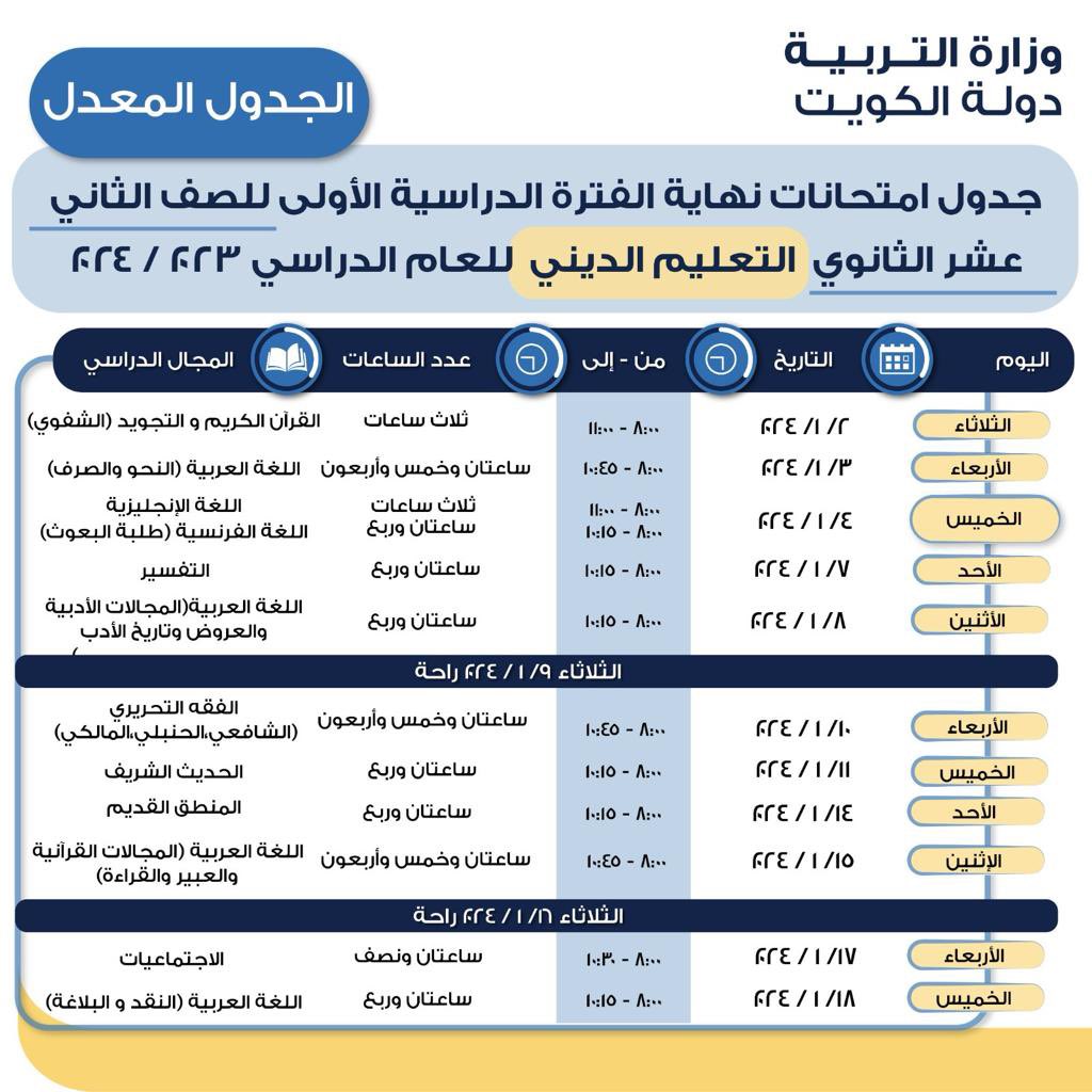 الجدول المعدل للاختبارات النهائية 2023 – 2024 للصف الثاني عشر الثانوي التعليم الديني