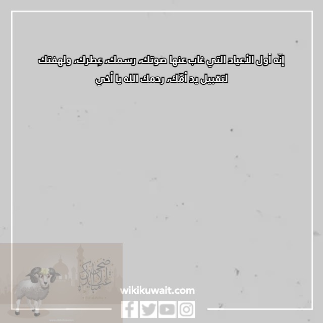 | العبارة الثانية | إنّه أول الأعياد التي غاب عنها صوتك، رسمك، عِطرك، ولهفتك لتقبيل يد أمّك، فأين نذهب من تلك الذّكريات التي حفرت نقوشها في الذّاكرة، وأين نذهب من تلك المشاعر التي باتت تحرق القلب والأحشاء، رحمك الله تعالى. |