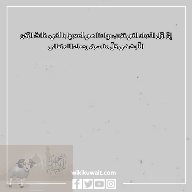 | العبارة الأولى | إنّ أوّل الأعياد التي تغيب بها عنّا هي أصعبها يا أخي، فأنتَ الرّكن الثّابت في كلّ مناسبة، وأنتَ حكاية الخير التي تفيض بالرحمات والفرحة على جميع ذويك، رحمك الله تعالى وطّيب لكَ المثوى، وجعلك في عليّن عند مليكٍ مُقتدر. |