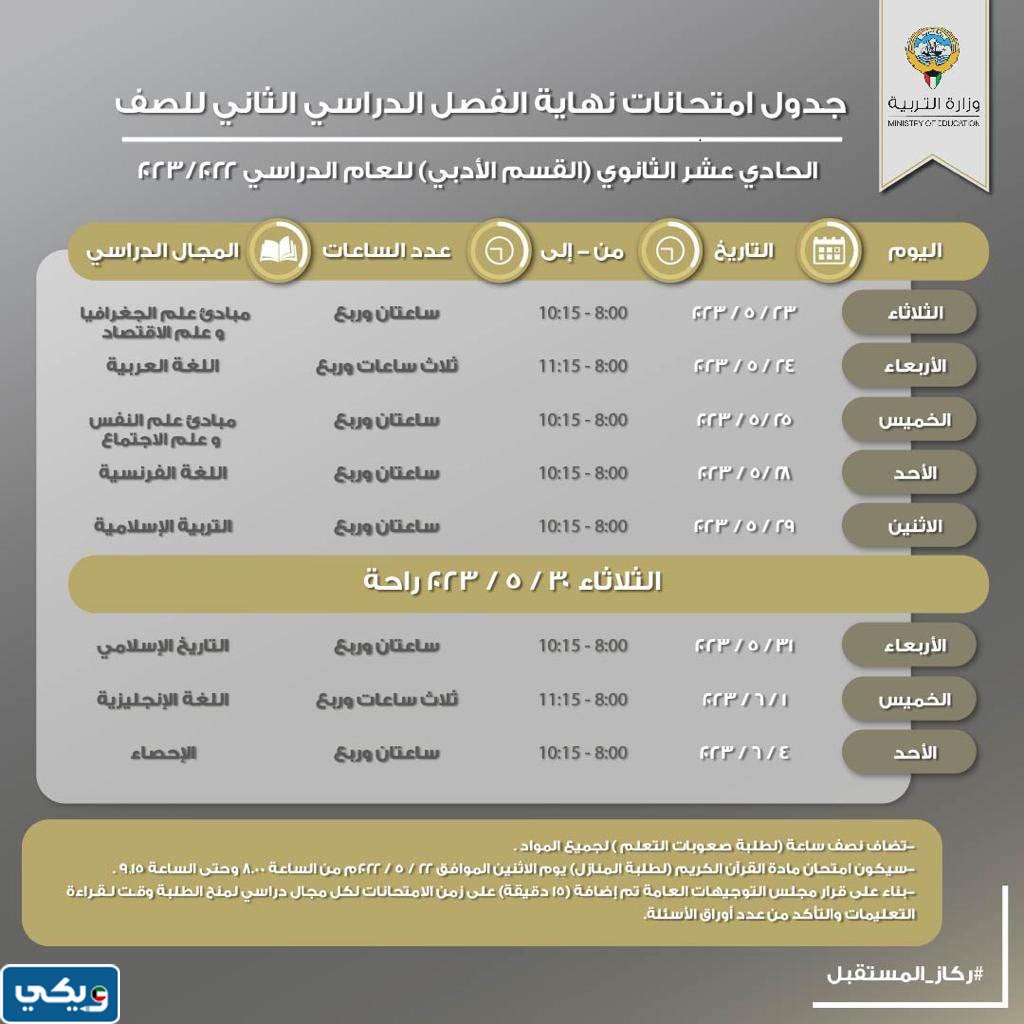 - 1.2 جدول امتحانات الثانوية 2023 الكويت الفصل الثاني الحادي العاشر الأدبي