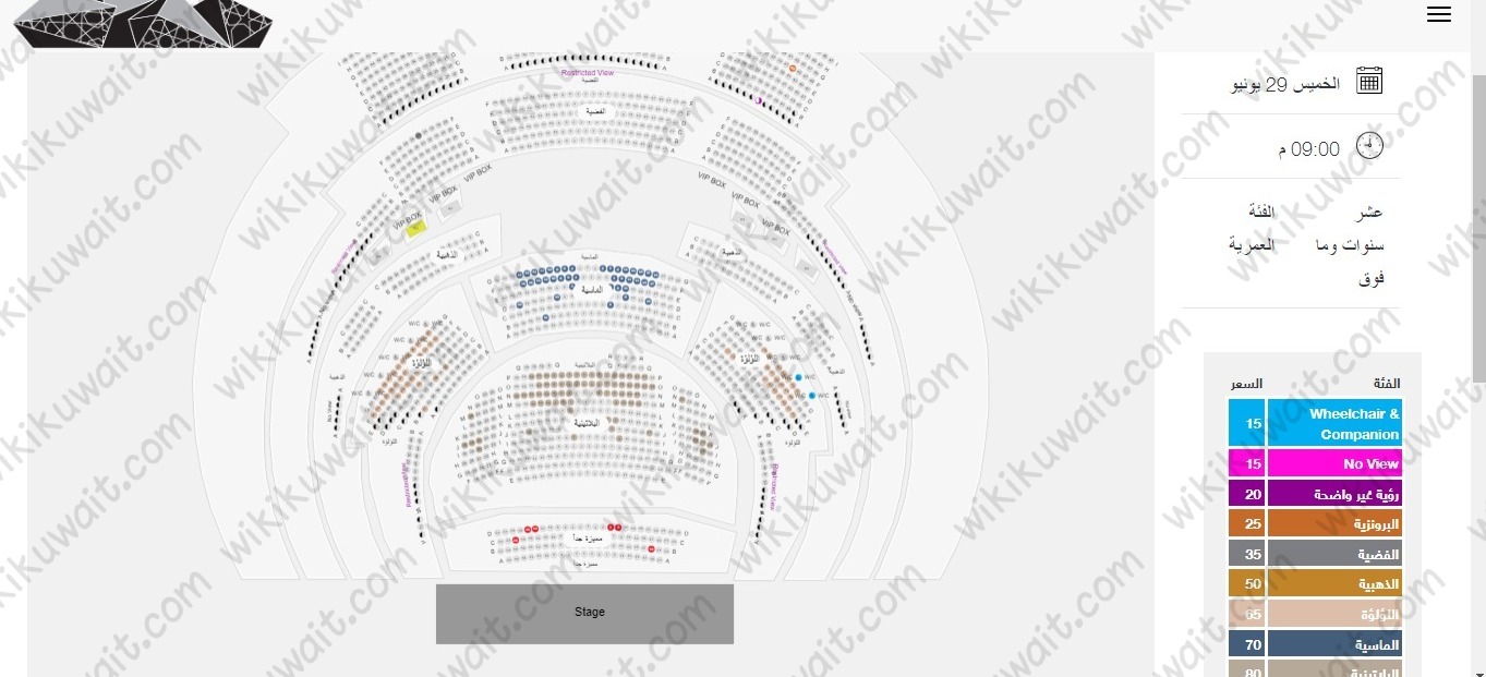 أسعار تذاكر حفلة مي فاروق المقامة في عيد الأضحى الكويت للعام 2023م تبدأ من 15 دينارًا كويتيًّا كما هو موضح أدناه: