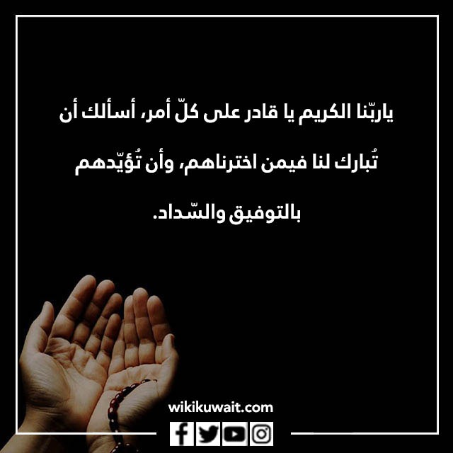 - يا ربنا الكريم يا قادر على كلّ أمر، أسألك أن تُبارك لنا فيمن اخترناهم، وأن تُؤيّدهم بالتوفيق والسّداد، وأن تجعل لنا فيهم الخير يا ربّنا الكريم.