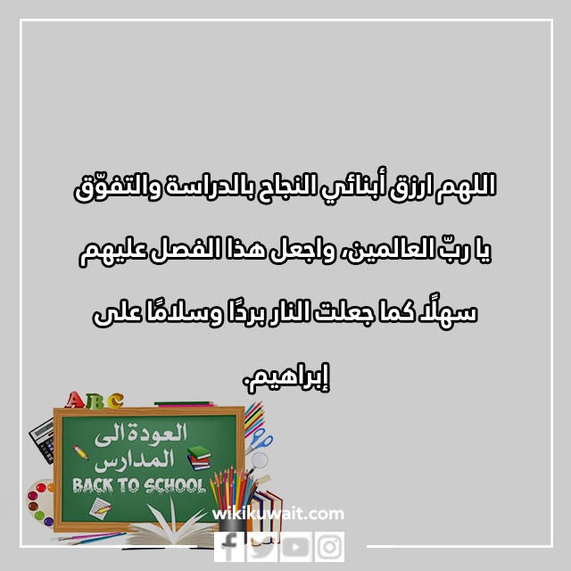 - اللهم يا ربّ الرّحمات أسألك أن توفّق أبناءنا في عامهم الدراسي، وأن ترسم بهم للأمّة مجدًا جديدًا، اللهم أخرج منهم العلماء والمهندسين والأطبّاء، وأصلح بهم شأن الأمّة يا ربّي الكريم.