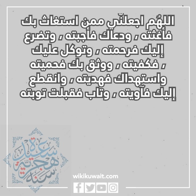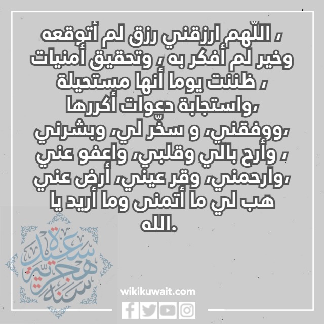 | الدعاء الأول | اللهم بقوة تدبيرك وفيض كرمك أسألك أن تدبّرني بأحسن التدابير في العام الهجري الجديد، وتُنجّيني مما يخيفني ويهمّني، اللهم لا أُضام وأنتَ حسبي، ولا أفتقر وأنت ربي ولا حول وقوة إلا بك. |