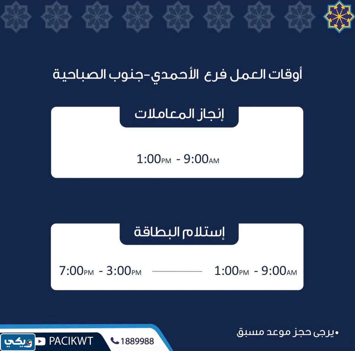 - مواعيد دوام استلام البطاقة المدنية فرع الأحمدي جنوب الصباحية.