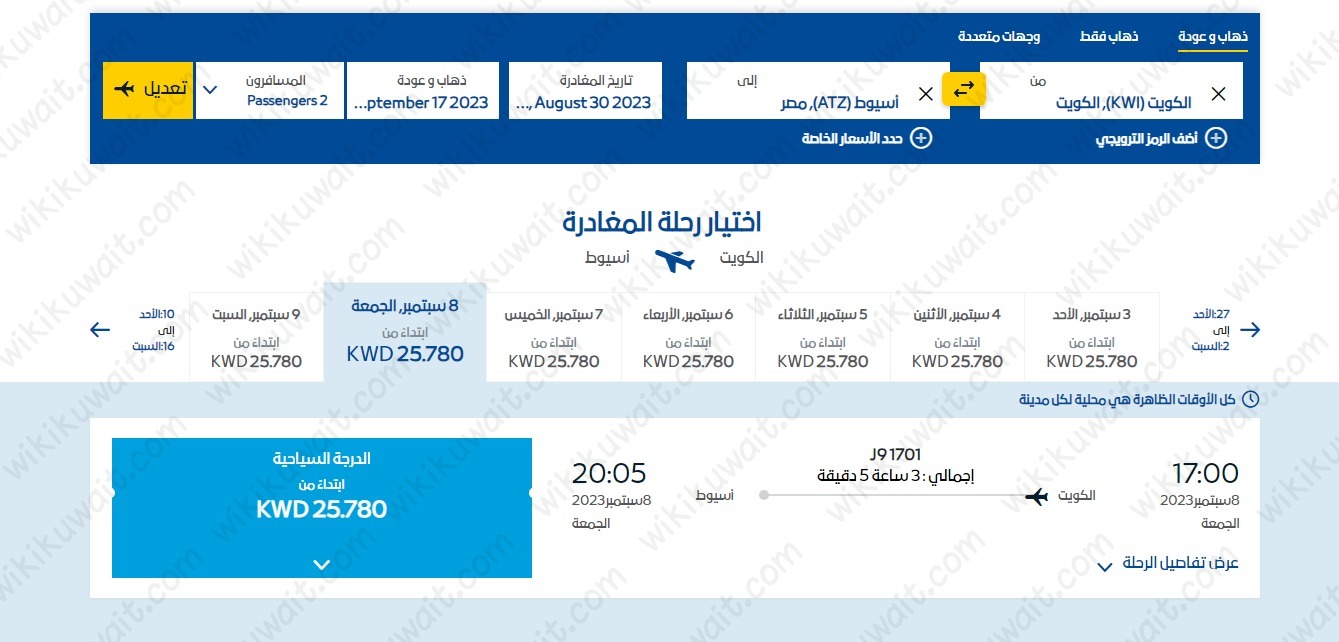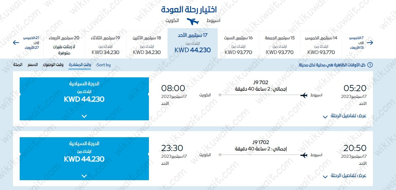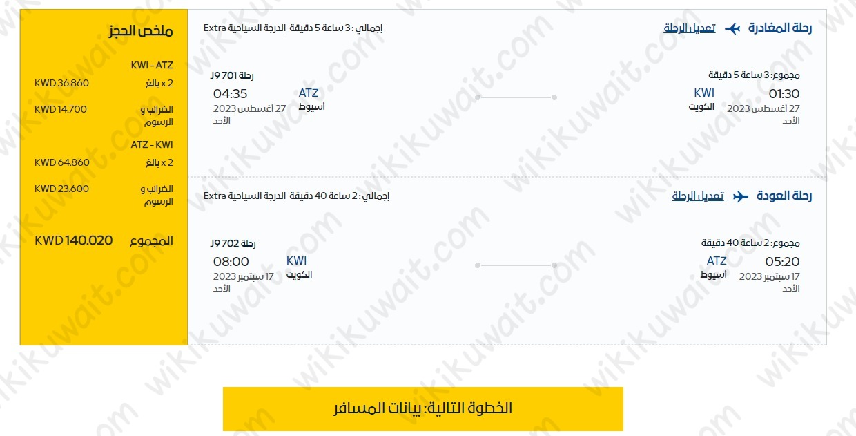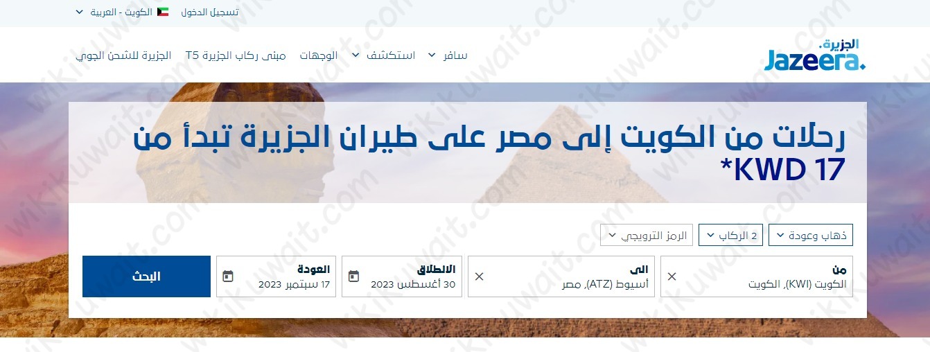 تتم عملية حجز رحلة من مطار الكويت الدولي إلى إحدى مدن مصر عبر شركة طيران الجزيرة من خلال ما يلي: