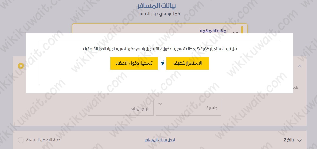 - تحديد طريقة الاستمرار بالحجز (الاستمرار كضيف، أو تسجيل دخول الأعضاء).