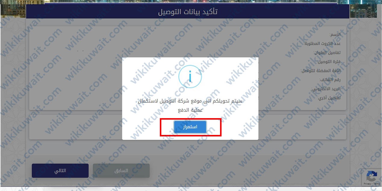 - الضغط على “استمرار” للتوجه إلى صفحة دفع رسوم التواصيل.