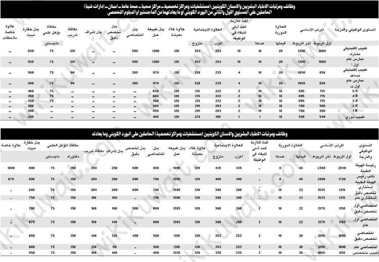 يحثل الأطباء الكويتيين الحاصلين على المستوى الاول أو الثاني من البورد الكويتي أو ما يعادلهما من الدبلوم التخصصي أو الماجستير العاملين في المستشفيات والمراكز التخصصية والمراكز الصحية والصحة العامة مراكز الأسنان والأدارات الفنية على الرواتب الموضحة في الجدول التالي: