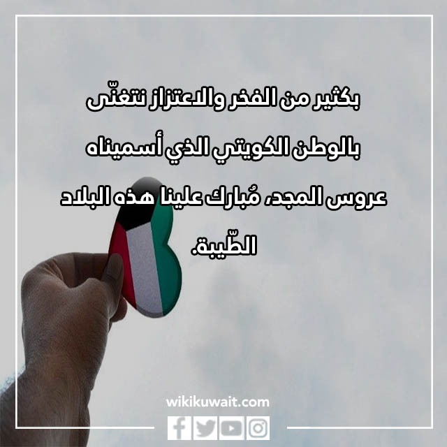 بكثير من الفخر والاعتزاز نتغنّى بالوطن الكويتي الذي أسميناه عروس المجد، تلك الدّيار المُباركة التي اختارها الله لنا لتكون مناسبتنا التي نُحبّها وتفيض بالخيرات.
