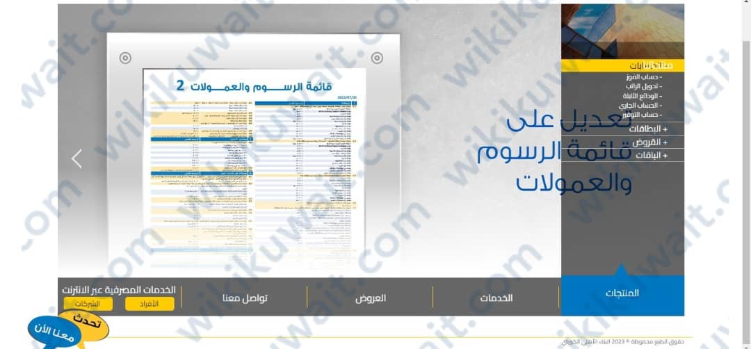 • تظهر نافذة منبثقة تتضمن منتجات البنك الأهلي الكويتي كما يلي: