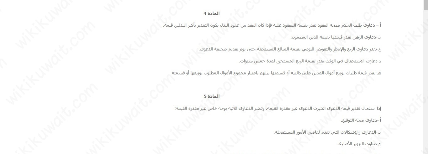 وردَ عن تقدير قيمة الدعوى في قانون الرسُوم القضائية الكويتي المرفقة ضمن المادة الخامسة كما يلي: