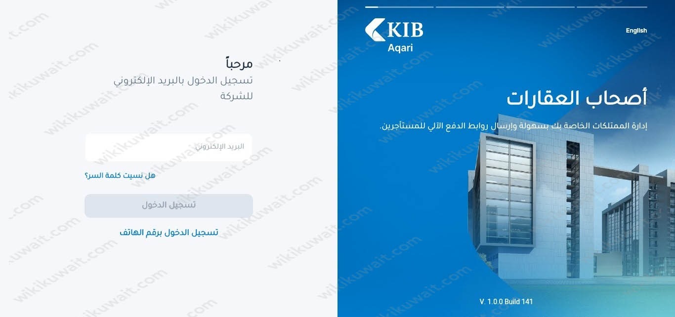 - تسجيل الدخول إلى منصة KIB Aqari باستخدام البريد الإلكتروني للشركة: