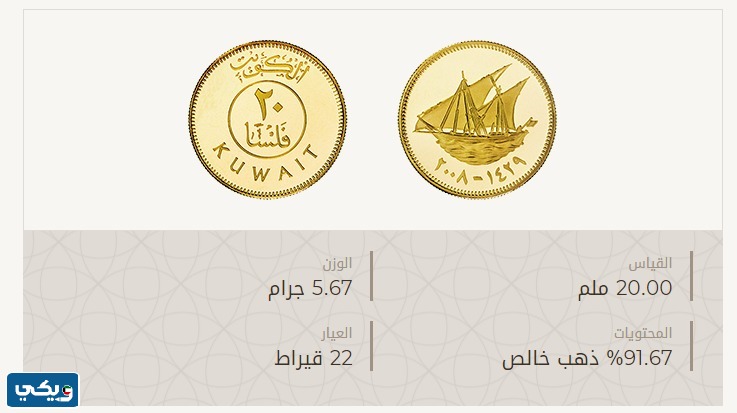| 20 فلس | 20.00 ملم | 5.67 جرام | %91.67 ذهب خالص | 22 قيراط |