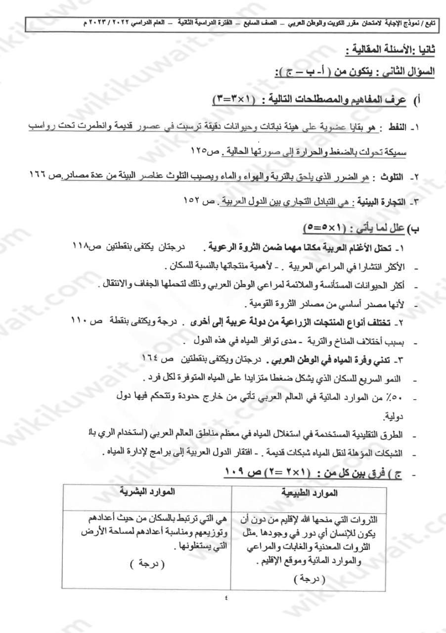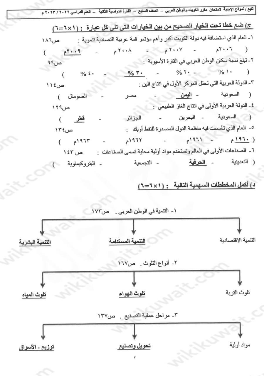 فيما يلي سوف يتم استعراض مثال على نموذج اختبار لمادة الاجتماعيات للصف السابع الفصل الدراسي الثاني بدولة الكويت مع الإجابات الخاصة به:
