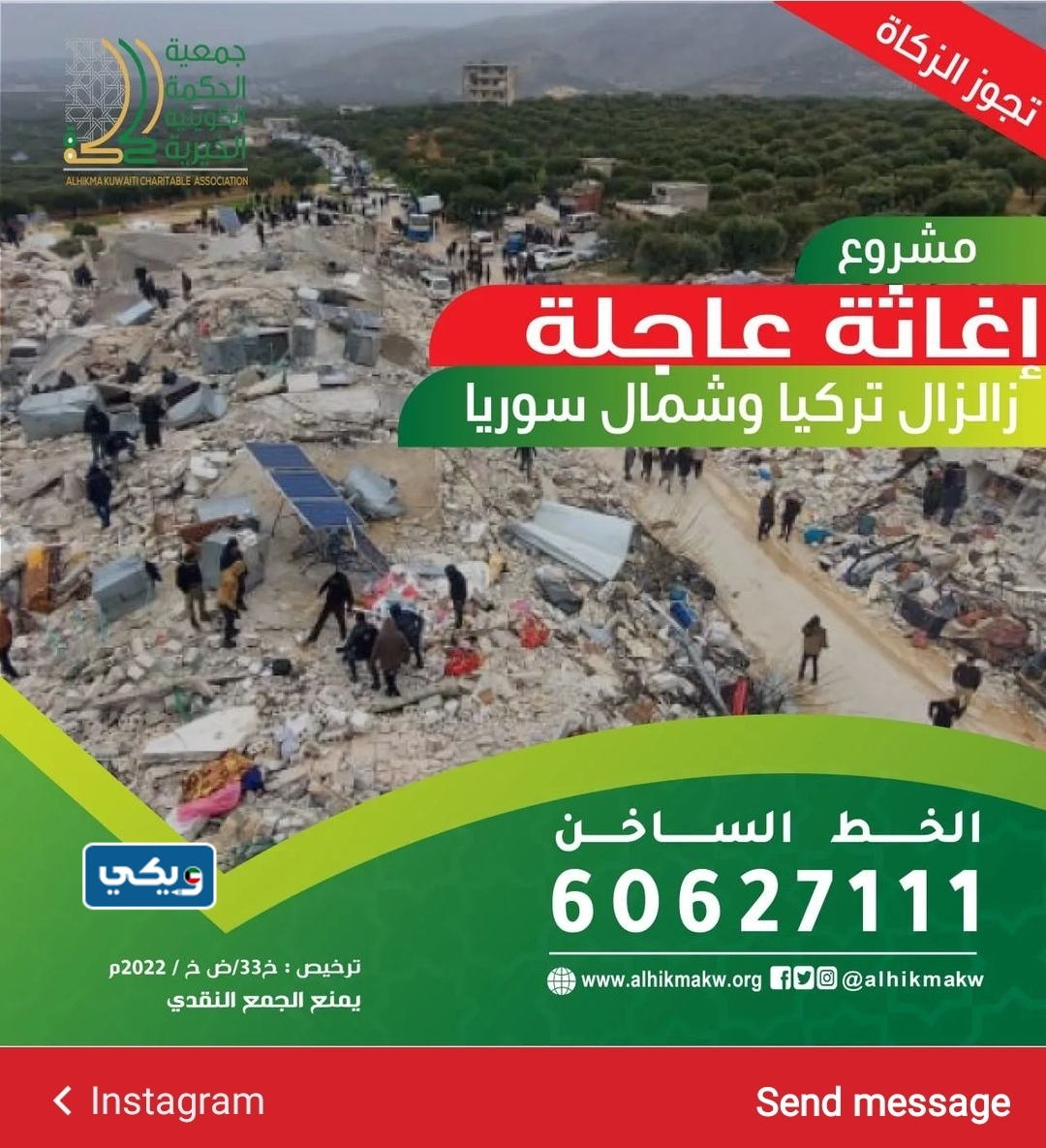 بذلك تبيَّن هل جَمعية الحِكمة الكِويتية مَوثوقة وطريقة التبرع من خلال جمعية الحكمة الكويتية لمتضرري الزلزال الذي ضرب سوريا وتركيا إذا لا يزال التبرع مفتوح حاليًا لإتمام كلفة مشروع الإغاثة المقرَّر تنفيذه.